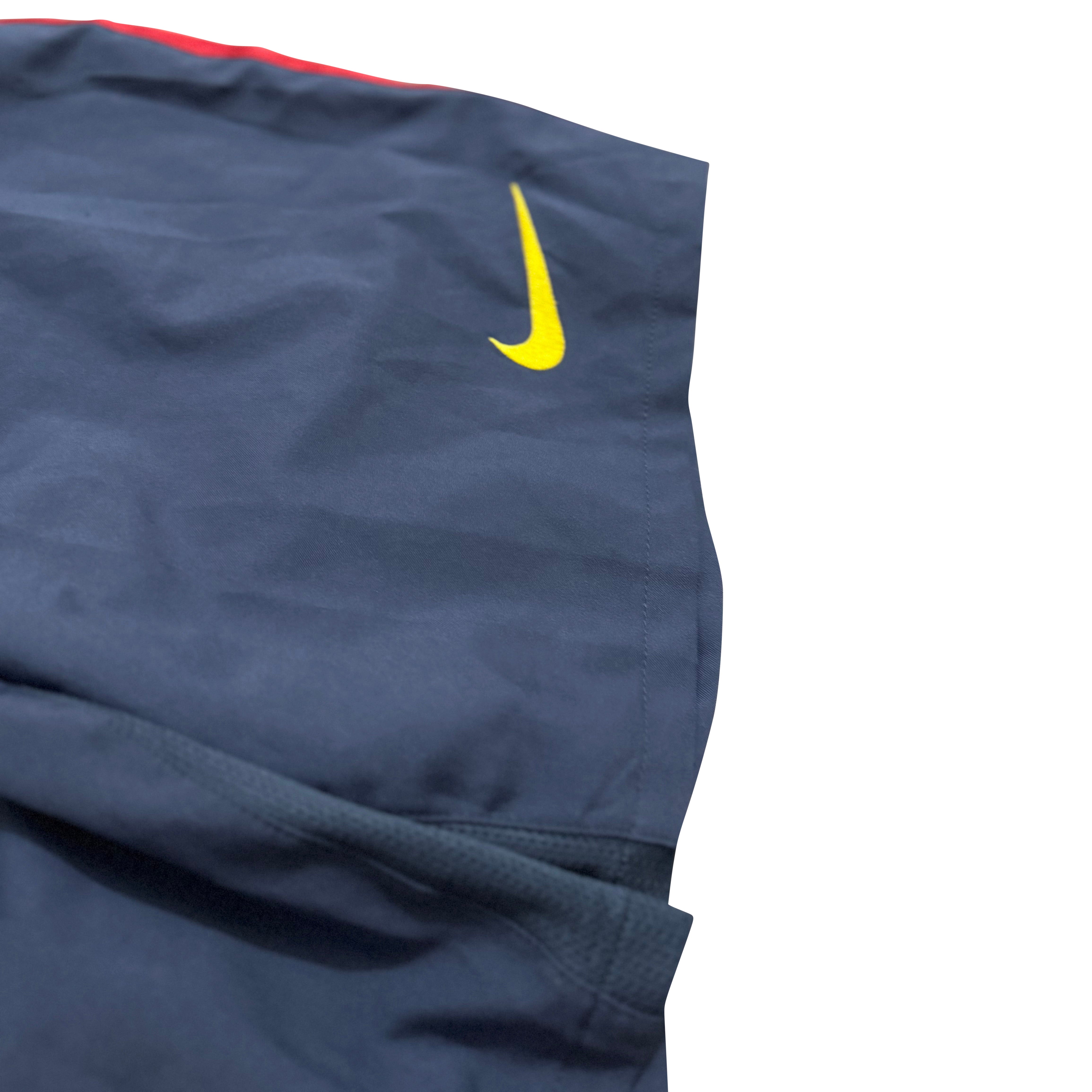 Train like a pro in these official FC Barcelona Nike Dri-FIT shorts. Designed in deep navy blue with striking red side stripes and bold yellow detailing, including the embroidered Swoosh and Barça crest. The lightweight, breathable Dri-FIT fabric keeps you dry whether you’re playing hard or styling casually. A performance-driven essential with iconic club pride.