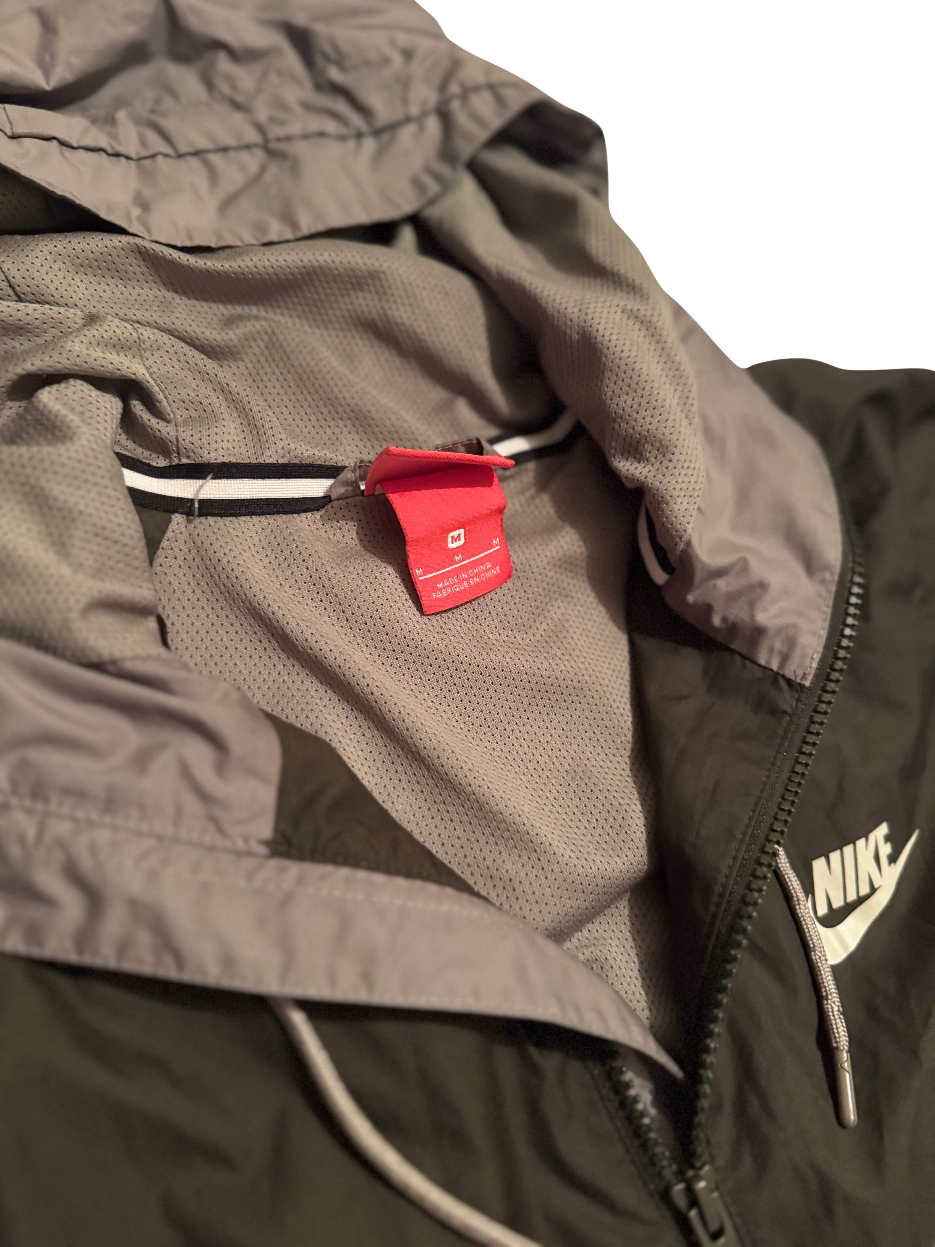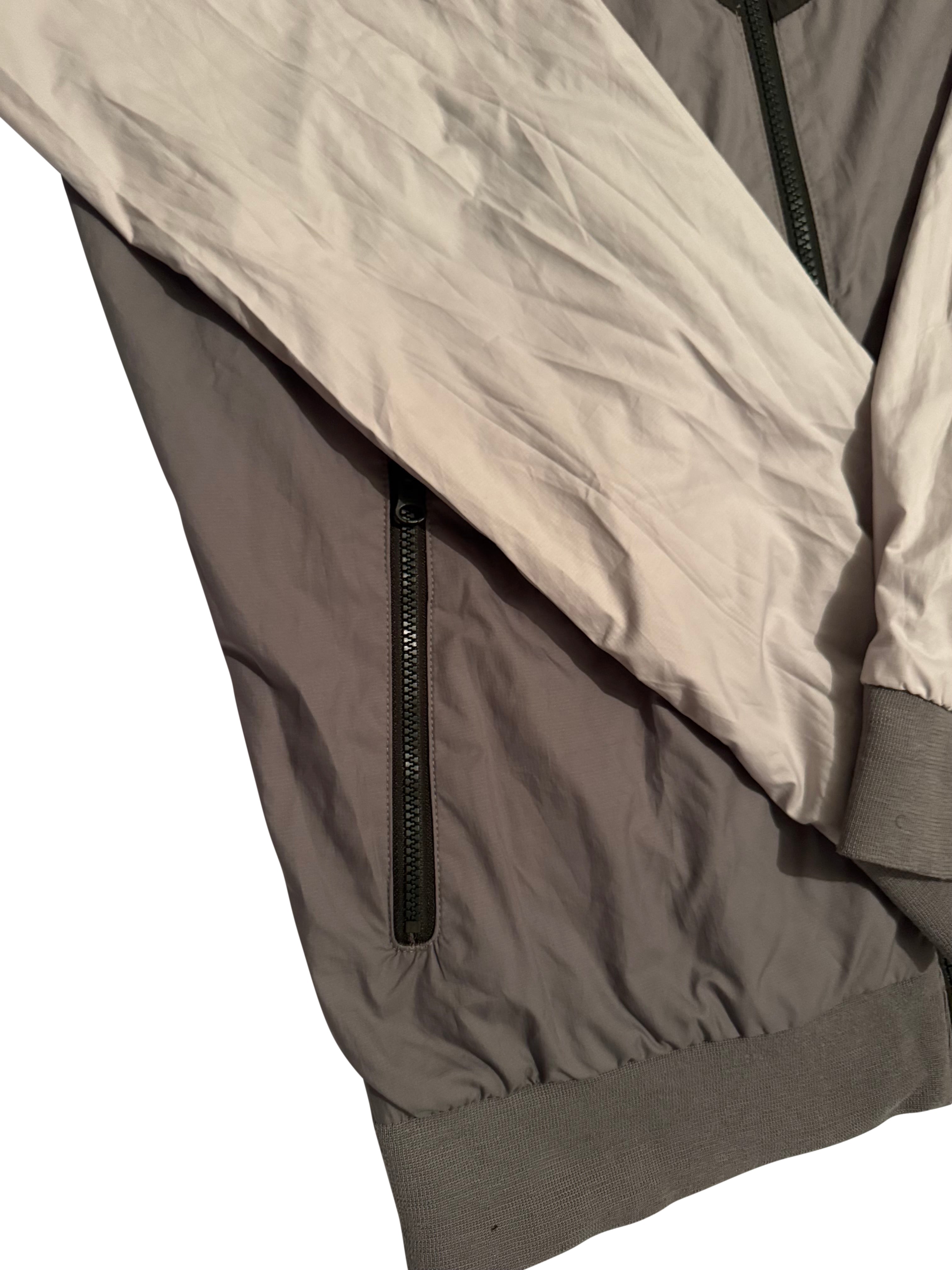 Lightweight, breathable, and packed with vintage flair – this Nike windbreaker features a unique tri-color design with black, grey, and beige panels in a sharp V-shaped layout. The white Nike logo on the chest adds that authentic retro touch. Finished with a mesh lining and a full hood, this jacket is perfect for layering or staying dry in style.
