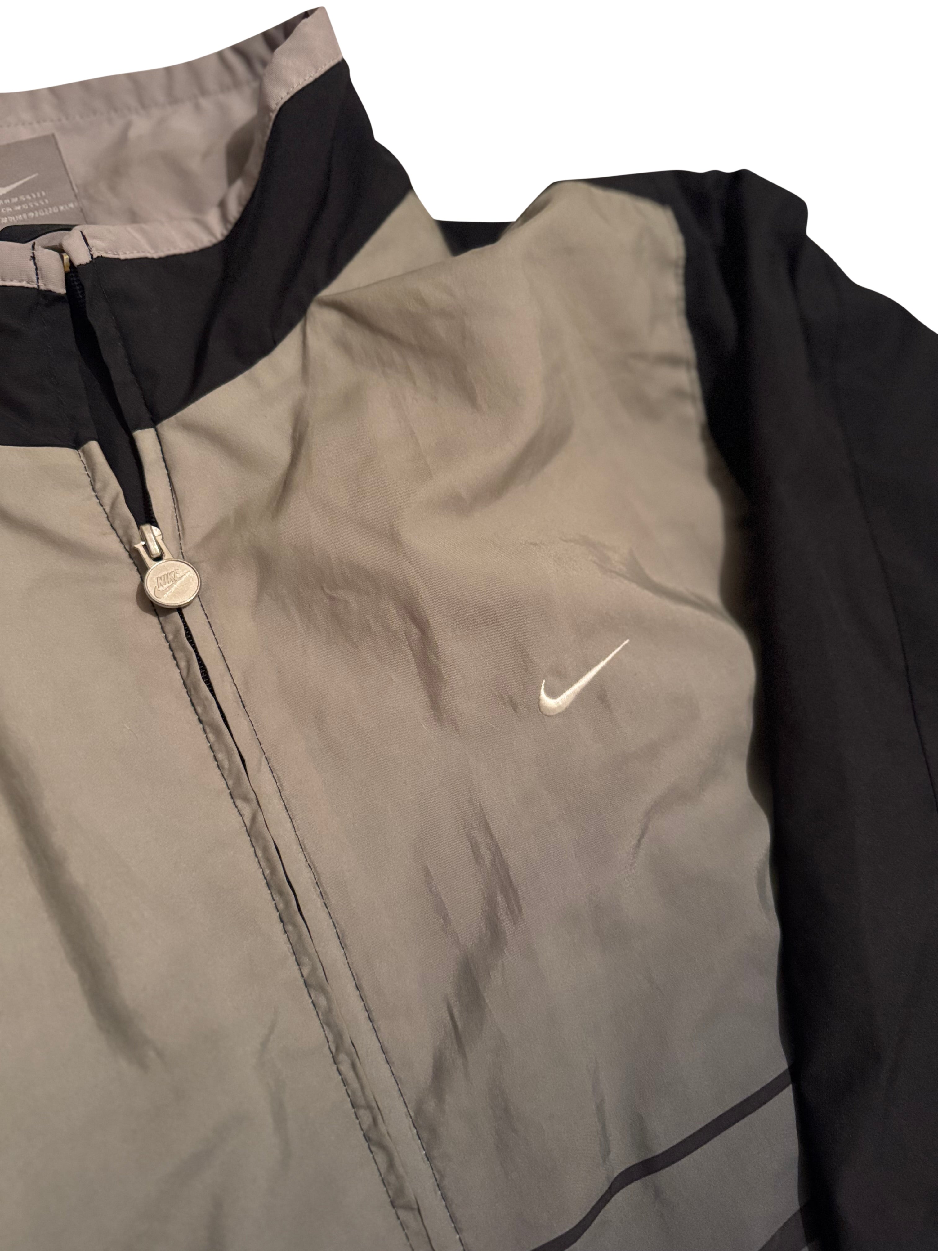 A sleek essential for vintage sportswear lovers – this Nike Windbreaker Track Jacket features a bold black and grey gradient design with horizontal stripe detailing. A minimal embroidered white Swoosh adds a clean, authentic Nike touch. Perfect for everyday wear, light training, or layering on cooler days.