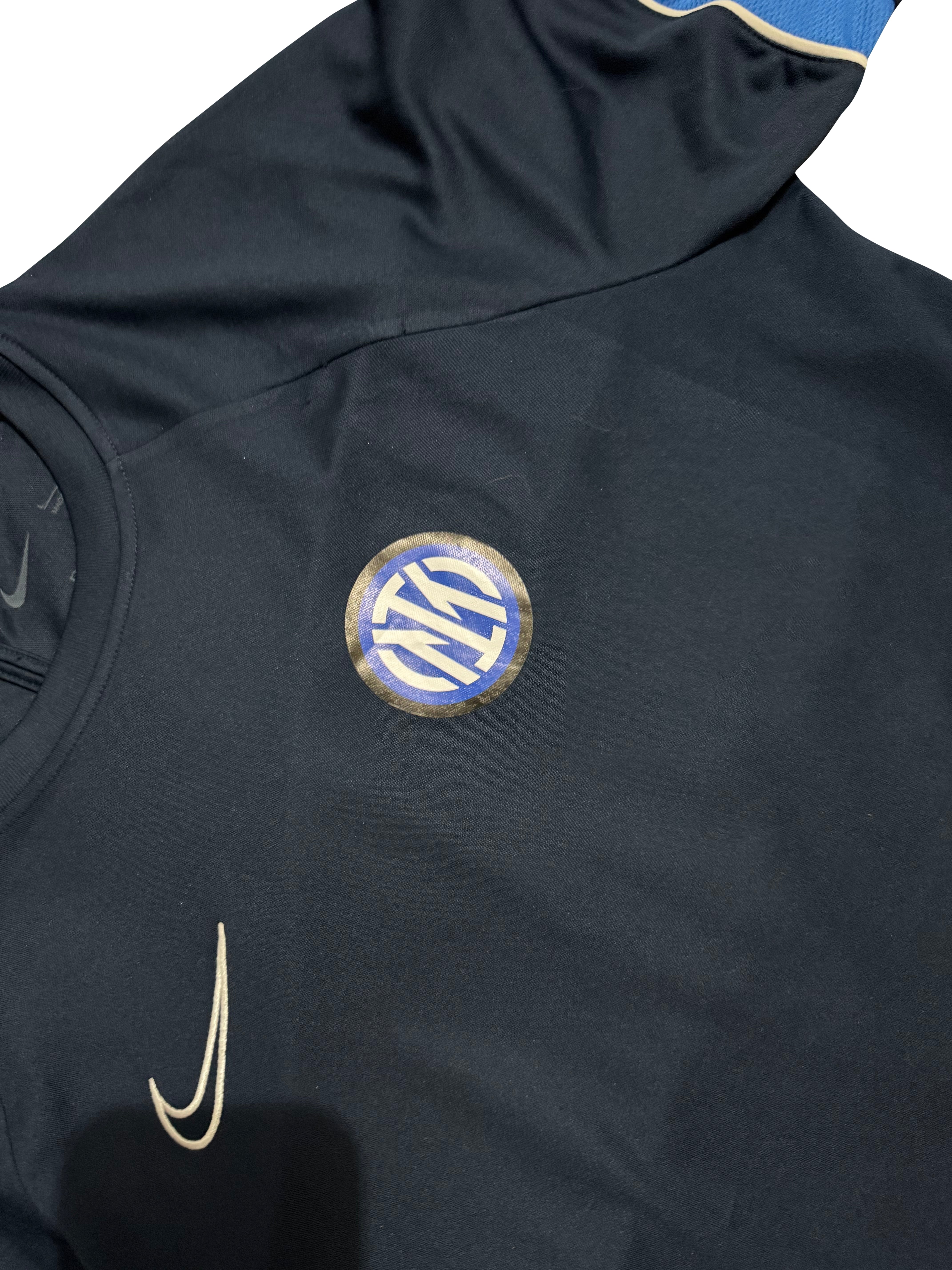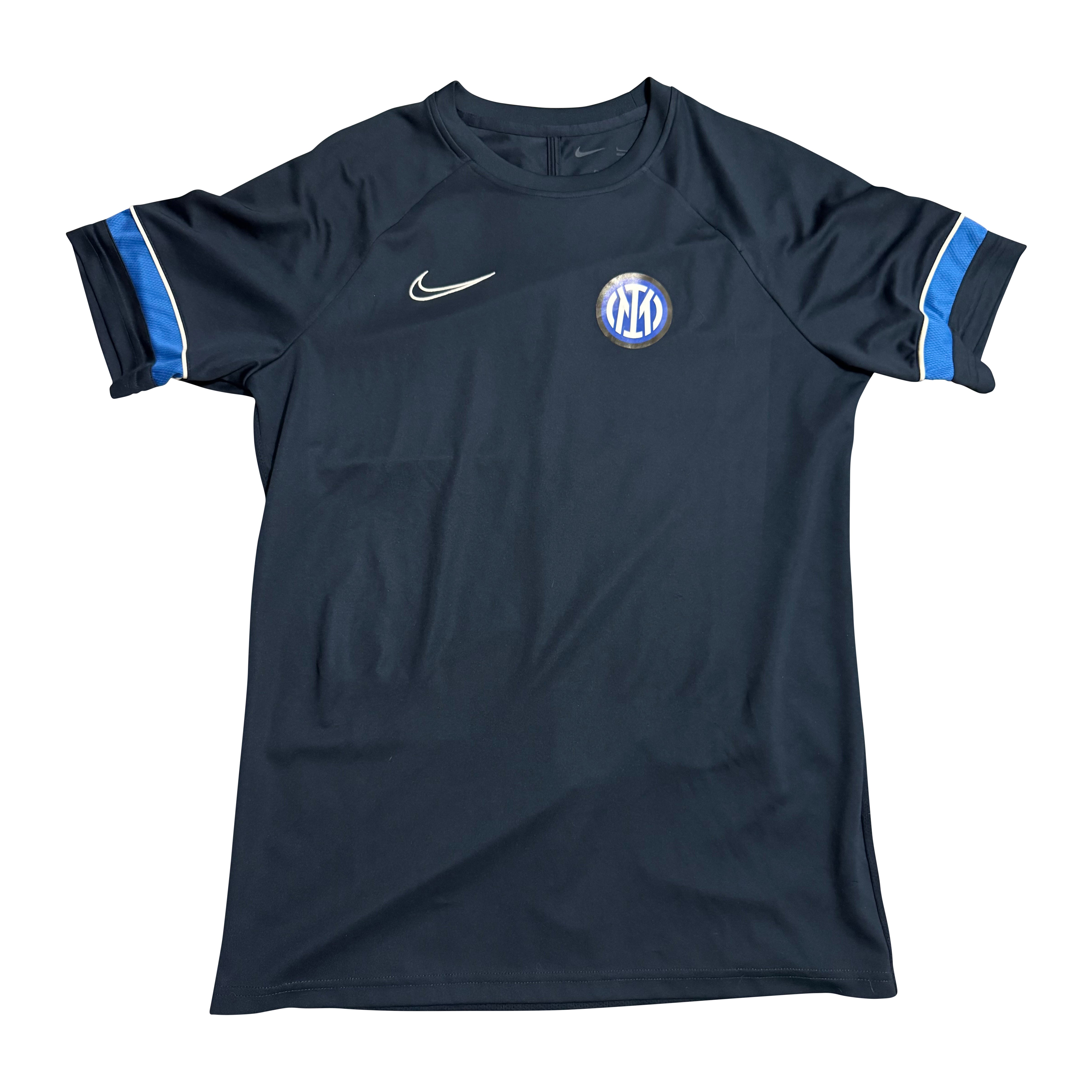 Classic Nike Inter Milan training shirt in a deep navy colorway with bold royal blue sleeve accents and white piping. Features the iconic Inter crest and a white Nike Swoosh on the chest. Made from lightweight Dri-FIT fabric for breathable comfort – perfect for workouts, football training or as a sporty everyday piece with vintage flair.