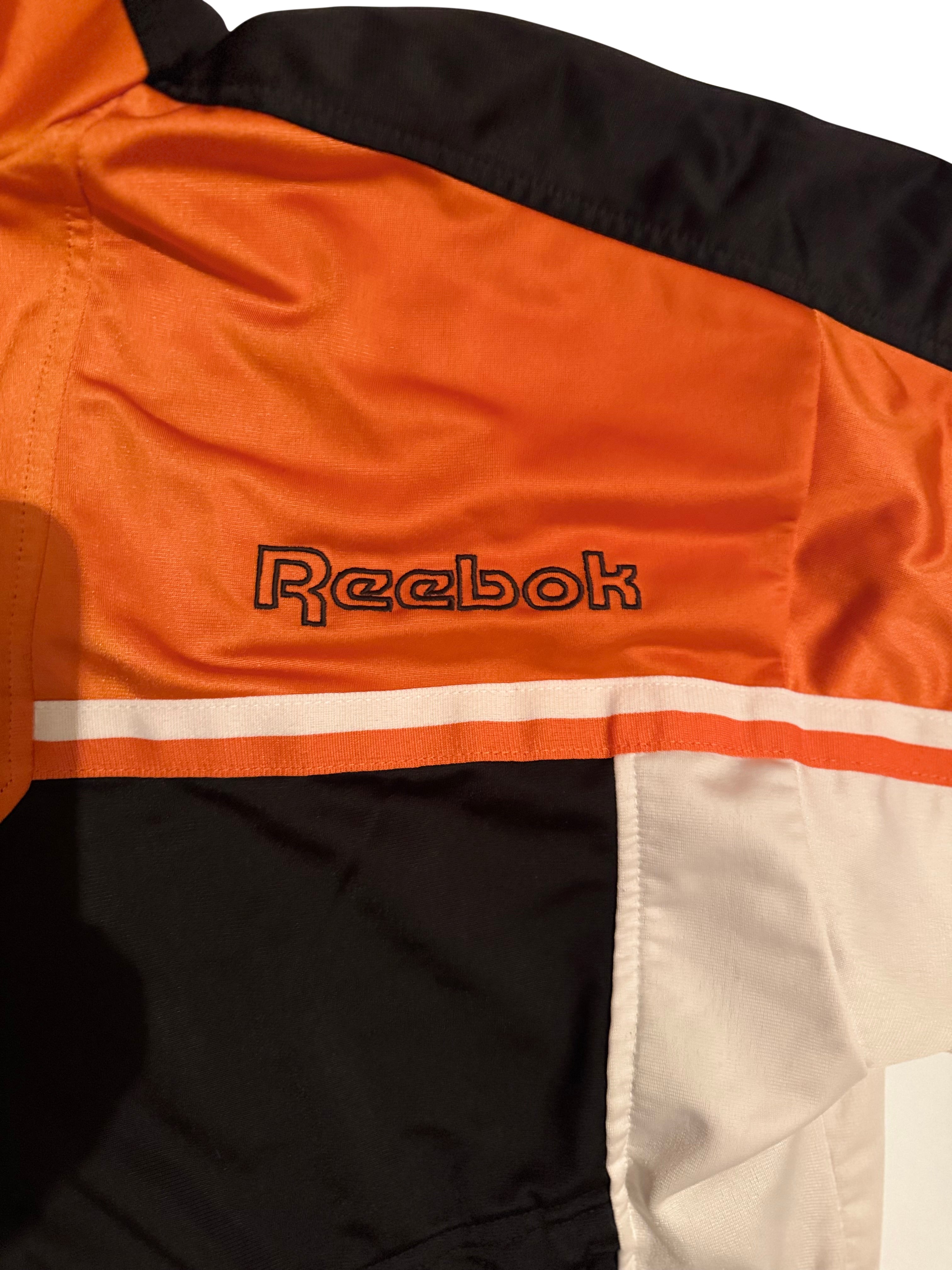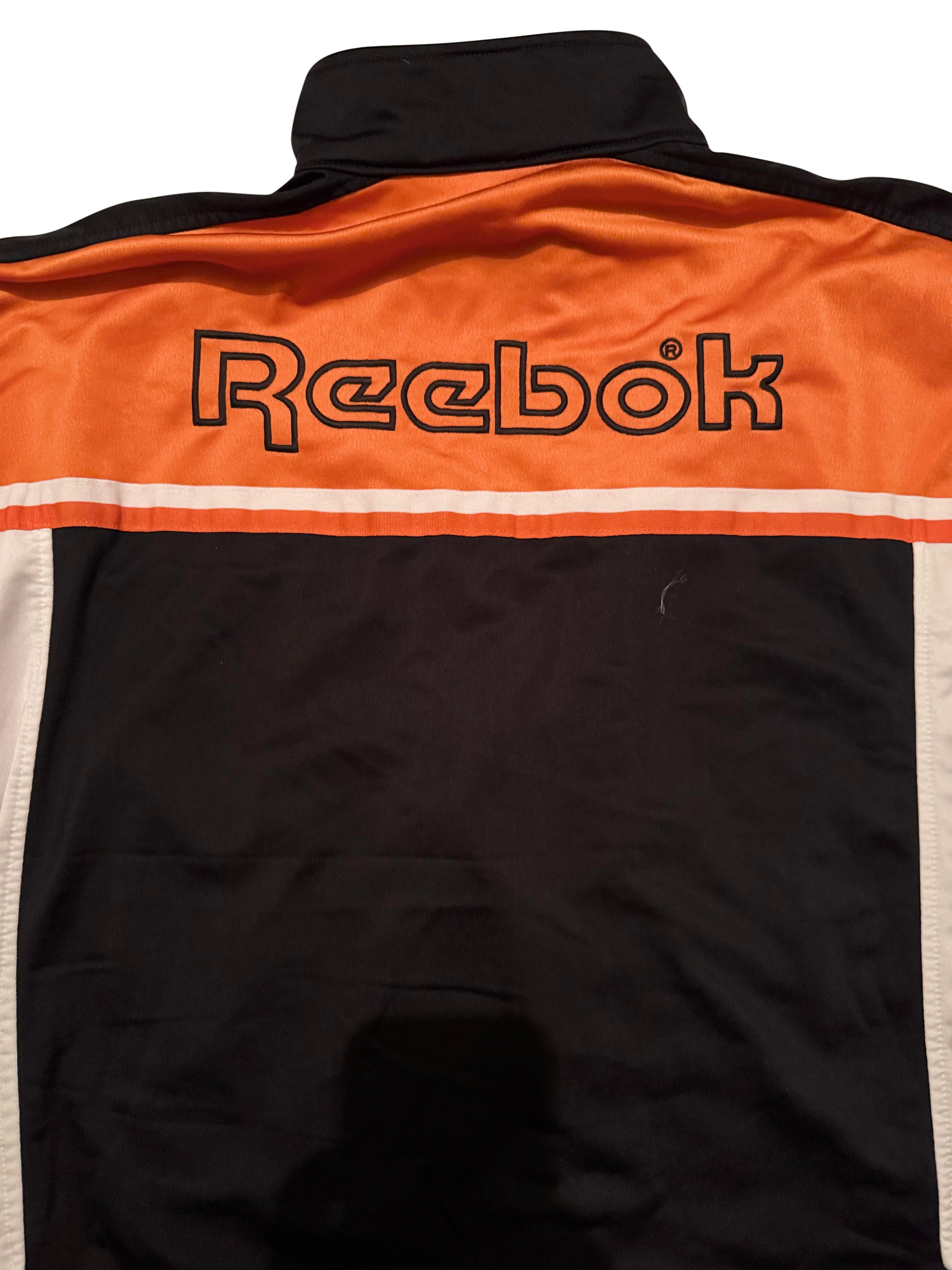 Straight from the archives – this vintage Reebok track vest brings pure retro energy. With a bold color block design in orange, black and white, plus embroidered Reebok branding on both front and back, it’s a standout layering piece for true vintage heads.